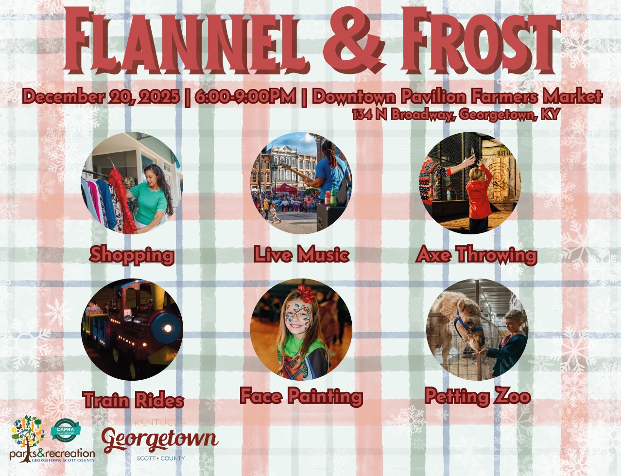 GEORGETOWN, KY, UNITED STATES, December 2, 2025 /EINPresswire.com/ -- A new old-fashioned family holiday festival is planned that will transform Scott County Farmers Market Pavilion into a festive forest. The inaugural Flannel & Frost takes place from 6 to 9 p.m. on Saturday, Dec. 20. The evening event is created and sponsored by Scott County Parks and Recreation and Georgetown/Scott County Tourism.