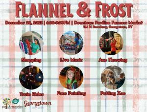 Flannel & Frost Festive Forest was originally known as Lumberjack Christmas, an event held by Georgetown-Scott County Parks and Recreation at its Pavilion indoor recreation center. The newly renamed and relocated festival takes place 6-9 p.m. on Saturday, Dec. 20, 2025, at the Scott County Farmers Market Pavilion at 134 North Broadway Street. Admission is free. For more information, contact Georgetown-Scott County Parks and Recreation at 502-863-7865.
