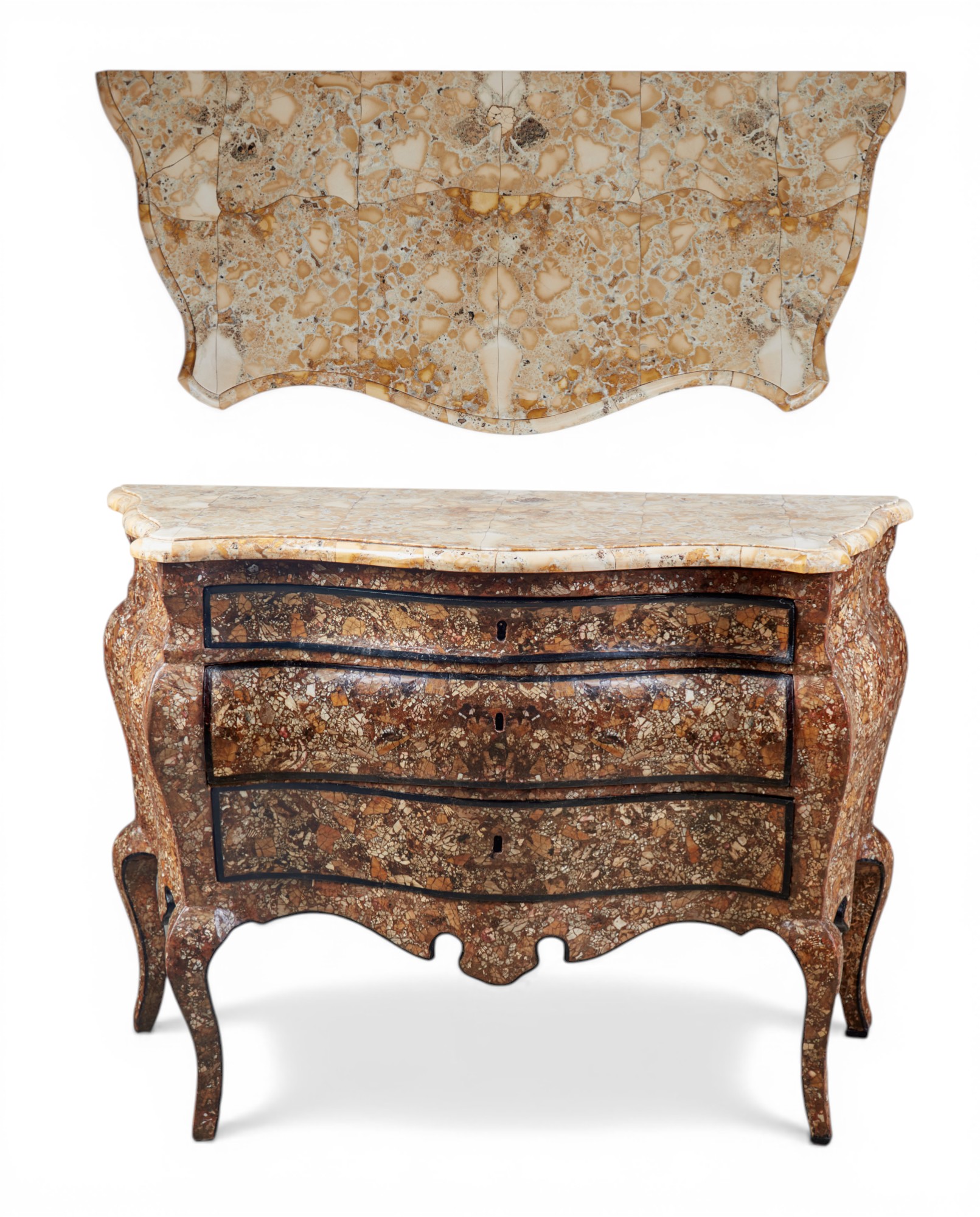 Rare, mid-18th century Sicilian Rococo parcel ebonized mother of pearl, shell and composition inlaid brown lacquer bombe commode (Sicily, King of Naples). Estimate: $40,000-$60,000