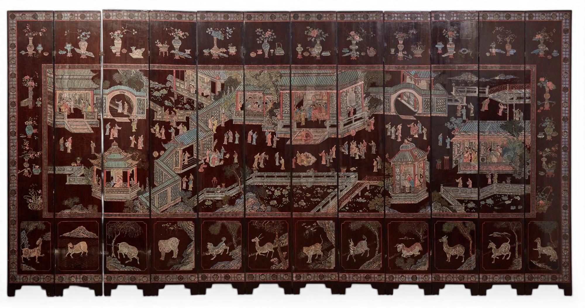 Striking cloisonné enamel objects and vessels feature a model of Manjusri on a lion ($2,000-$3,000). There are also a number of large Chinese gilt lacquered wood models of Buddha and Bodhisattvas ($1,000-$4,000). An impressive coromandel lacquer screen with an illustration of Teng Wang Ge Xu is offered at $15,000-$25,000.